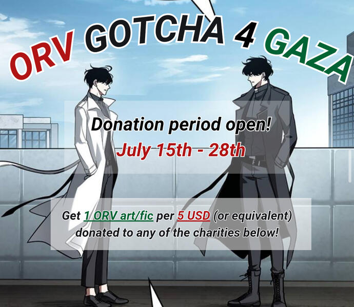 This is a charity event by ORV fans to raise funds for the people of Palestine, inspired by the success of previous fandom Gotcha for Gaza charity events. We are not affiliated with SingShong or the ORV webtoon.In this event, those who donate at least 5 USD (or equivalent) directly to verified Palestinian fundraisers can claim free ORV fanworks from volunteer fanartists and fic writers.TIMELINE:1 - 14 July: Creator signups (CLOSED)